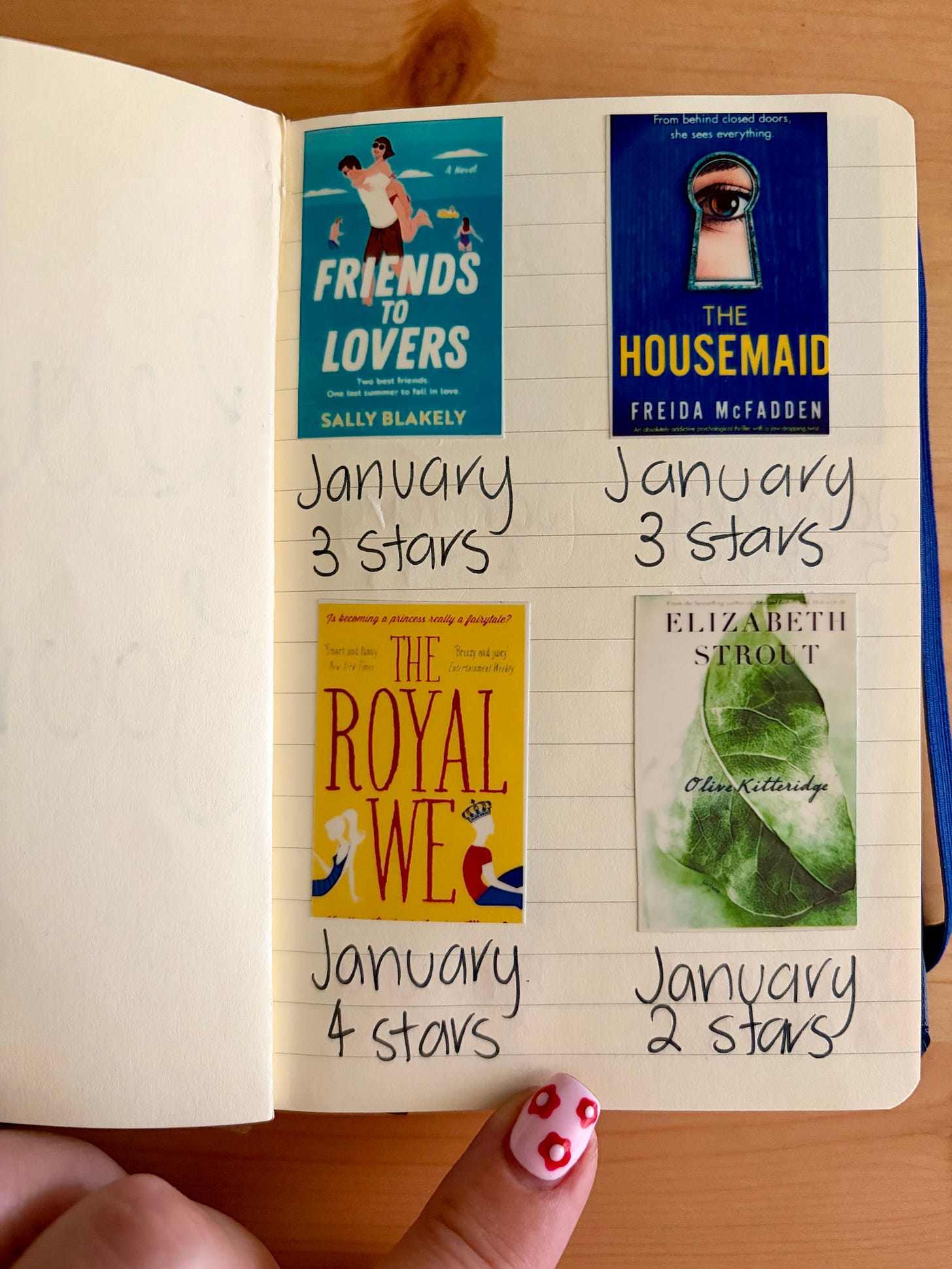 I bought a secondhand HP Sprocket printer (mine isn’t this exact one, but it’s similar) from FB marketplace this week, & it came with 2 packs of sticker paper, so I can print little book covers. I’ve ordered a little star rating stamp from Temu ( I know, I know, I am a garbage human, but I love all their little stationery stuff!), which will look cuter than my ugly handwriting, & that’s it. I’ll write the month I read it & how many stars I gave it. Very basic, but how cute is the cover? I made that sticker from a picture I cut out of a Frankie magazine ( I made the bow & scrapbook on the front of my Grow Journal, too!).