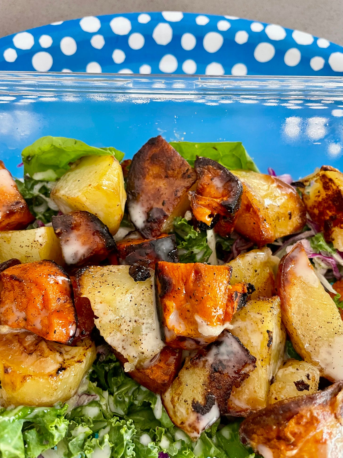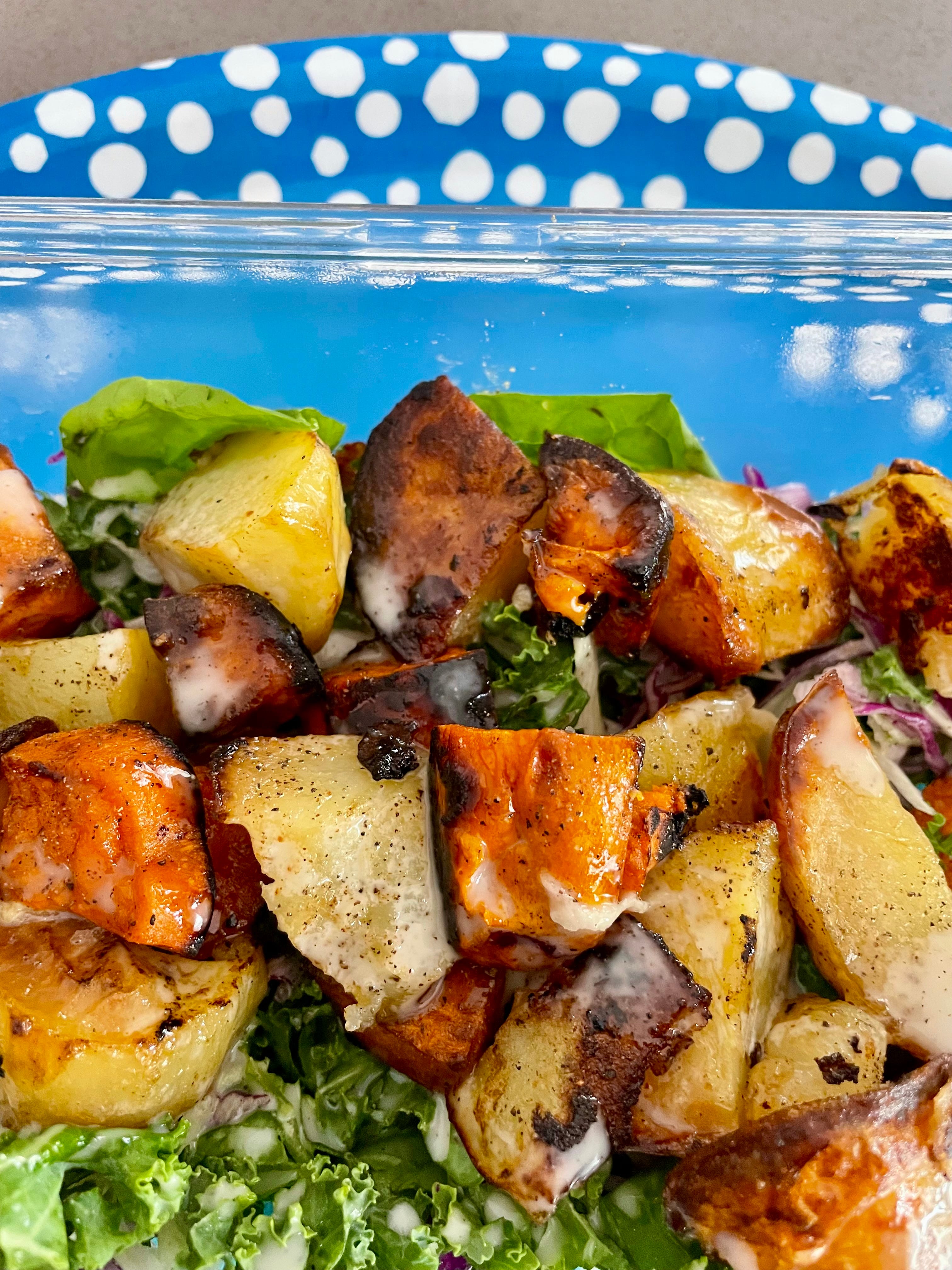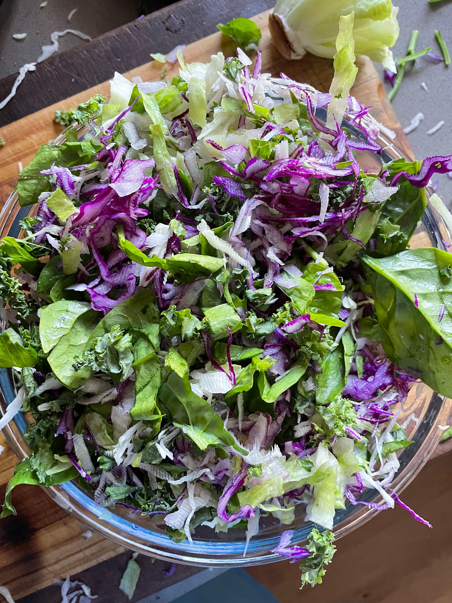 This is my salad of the moment. It is chopped kale, red & green cabbage, cos lettuce, baby spinach & red onion. I make a big batch so we can eat it for 2 days. I like making this dressing or this Caesar dressing to have with it. We’ve been eating alongside bbq meats, wings, chicken schnitzels or zuchinni slice.