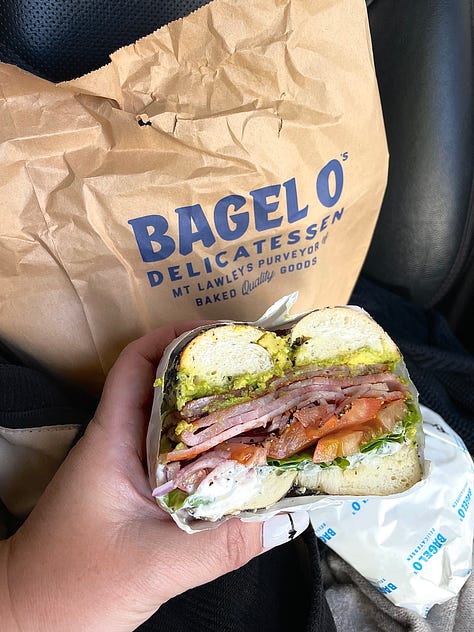 Hi friends! It’s Saturday afternoon, and after a week of cooler temps (low 30s!), it’s hot again. Blurgh. Tim and Blake are off at a motocross event, the first of the year, and today, Sadie and I visited two book sales and two op-shops. The book sales were a bust. One was so busy we could barely move. I got claustrophobic and overwhelmed, so we left after 15 minutes. We did come home with a stack of new books for Sadie, two books I have already read but wanted for my collection, a cardi and a jumper for me, so it was not a total waste of time. I found a bagel shop in Subiaco and grabbed a BLAT, two plain bagels, a blueberry bagel and a donut! Sades only wanted Maccas, so we did drive-thru for her.